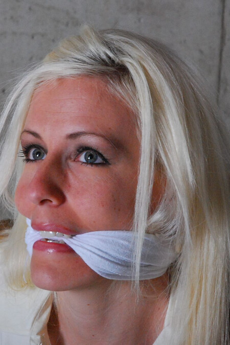 58 images: Just about busting out of that blouse, stockings, stiletto high heels, black mini skirt, hemp rope breast harness, cinched ropes, cleave gag