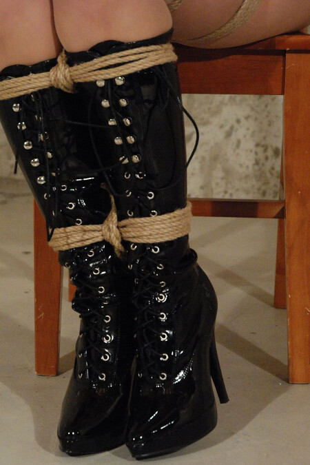 60 images: Knee high stiletto boots, lace top stockings, big ball gag, black mini skirt, hemp ropes